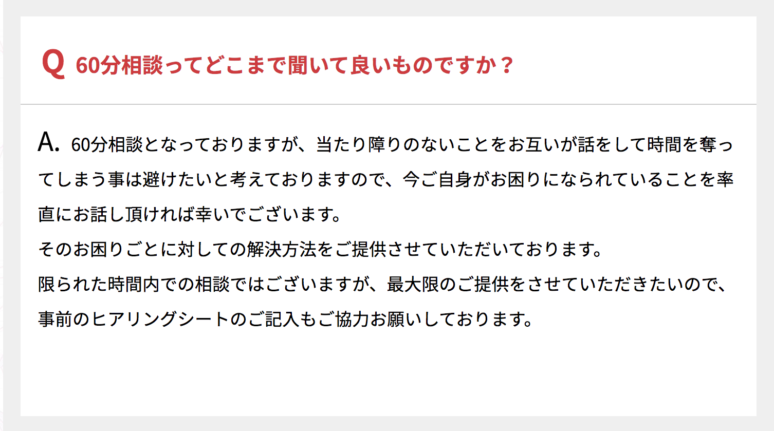 面談60分で今抱えていらっしゃる課題に関して一緒に解決法を見つけてまいります。